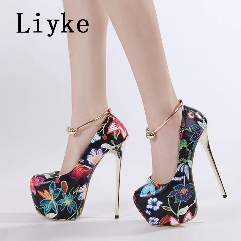 Floral high-heeled shoes with gold ankle straps on a white background, featuring the brand 'Liyke'.