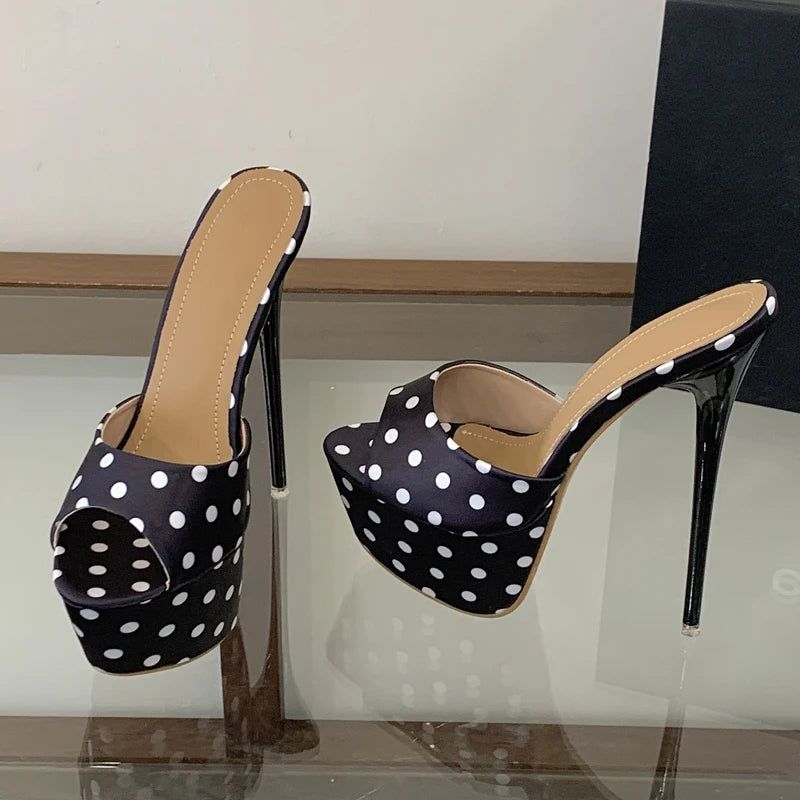 Elevate your style with these stunning polka dot platform high heels. Featuring a sexy open-toe design and thin heel silhouette, these mule heels deliver bold street style with effortless sophistication. The super-high heel (8cm+) paired with a supportive platform creates a flattering, elongating effect while maintaining comfort. Crafted with quality PU materials and a durable rubber outsole, these heels are designed for all-day wear. The pull-on closure makes them easy to slip on, while the true-to-size fit ensures a perfect fit. Available in sizes 34–46 to suit every foot. Perfect for summer outings, nights out, or whenever you want to make a statement. These women's heels combine contemporary design with wearable elegance—your go-to choice for confident, head-turning looks.